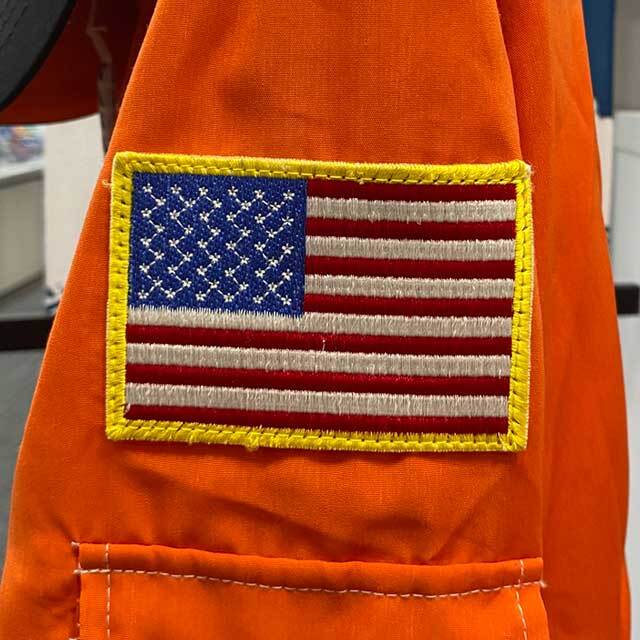 胸にはNASAの「ミートボール」ロゴワッペンと司令官を表す「COMMANDER」のワッペン、上腕にはアメリカ国旗とスペースシャトルプログラムの三角形ワッペンが、それぞれ縫い付けられています。