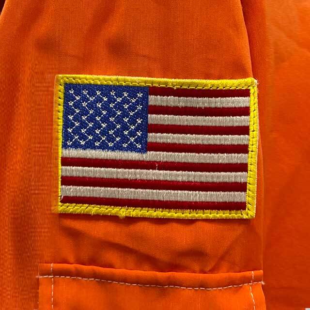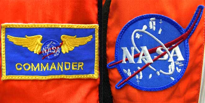 胸にはNASAの「ミートボール」ロゴワッペンと司令官を表す「COMMANDER」のワッペン、上腕にはアメリカ国旗とスペースシャトルプログラムの三角形ワッペンが、それぞれ縫い付けられています。