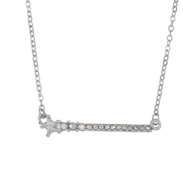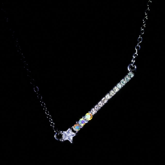 宙ジュエリー「流星」には、全5色のストーンを使用しています。実際の流星が放つ光の軌跡のように、色合いが次第に淡くなり、やがて消えていく一瞬の輝きを表現しました。やさしいトーンのストーンと、人気のバータイプネックレスを意識したデザインで、さまざまな装いに合わせやすいジュエリーに仕上げています。