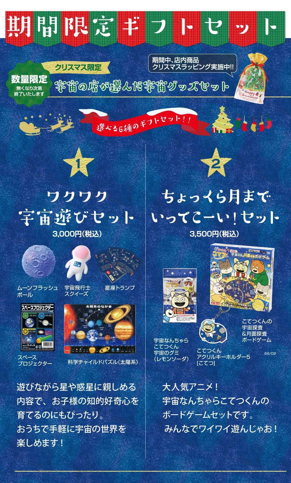 TOP 特集 宇宙の店のクリスマス 2025 特集 宇宙の店のクリスマス 2025 12/2(火)~ 12/25(木) ※11/21(日)は「10:30~18:00」にて営業致します。12/7(日)、14(日)は休業になります。 今年もやります 「宇宙の店のクリスマス」! 楽しいコンテンツが 盛りだくさん! クリスマス・ギフトセットや お買い得な商品もご用意して お待ちしています! 詳細はこちらから 詳細はこちらから 詳細はこちらから 詳細はこちらから 詳細はこちらから ※ギフトセットは 宇宙の店 浜松町本店限定になります。 ※ギフトセットは 宇宙の店 浜松町本店限定になります。 イベント開催中は展示を中止いたします。 ・12/10、17/ 17:00~20:00 ・12/13、20、21 / 終日 イベント開催中は展示を中止いたします。 ・12/10、17/ 17:00~20:00 ・12/13、20、21 / 終日 2025.12.09 13:05 特集